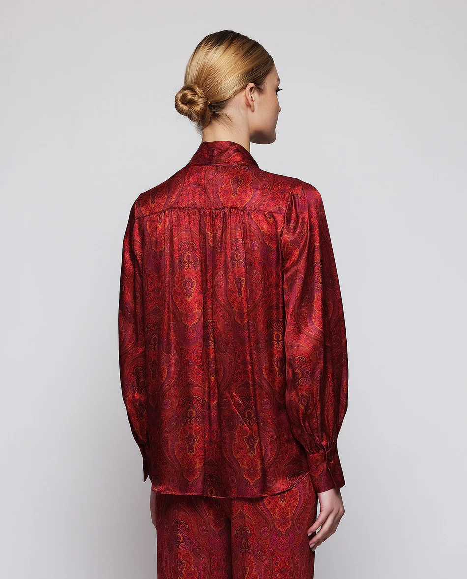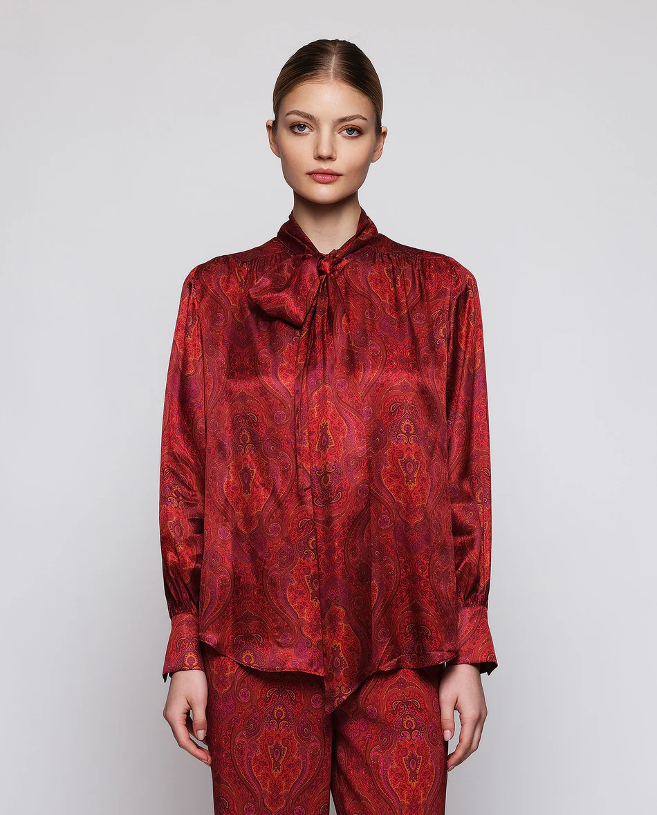Blusa en tejido estampado paisley con cuello redondo con lazada, cierre central con botones, hombros con frunce y manga larga ligeramente abullonada. Composición: 65%viscosa, 35% seda. Crea tu total Look con el pantalón PAISLEY.
