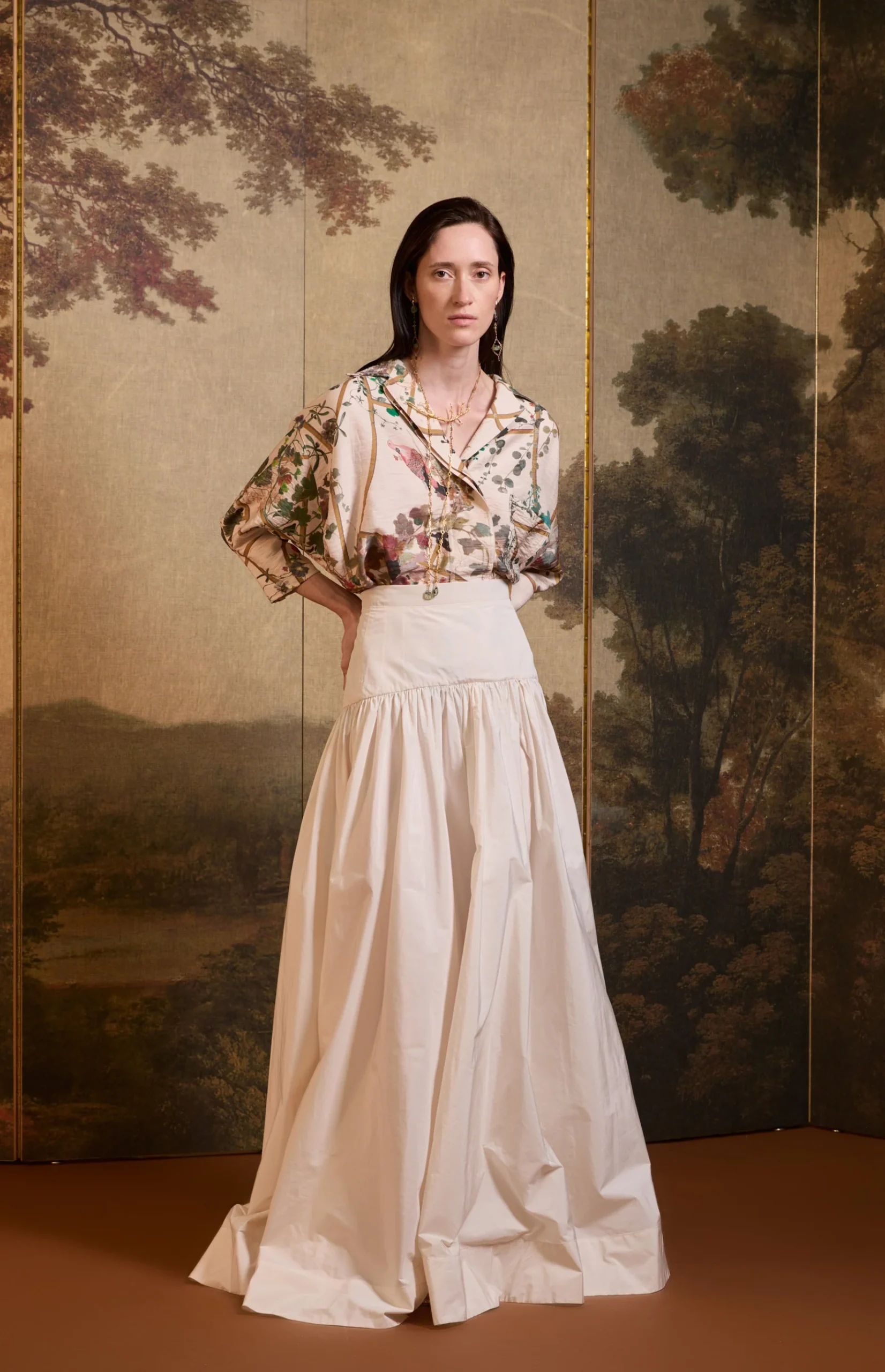 Blusa oversize con estampado Ailanto: «Pérgolas y pájaros» pintura original a tempera donde diversas aves descansan sobre una estructura oval. Murales pompeyanos susurran un pasado vibrante que inspira jardines paradisíacos. Composición: 88% VE 18% PO.