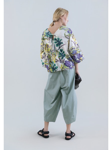 Blusa con estampado de hojas en tejido 100% algodón. Manga tres cuartos y bajo ajustable.