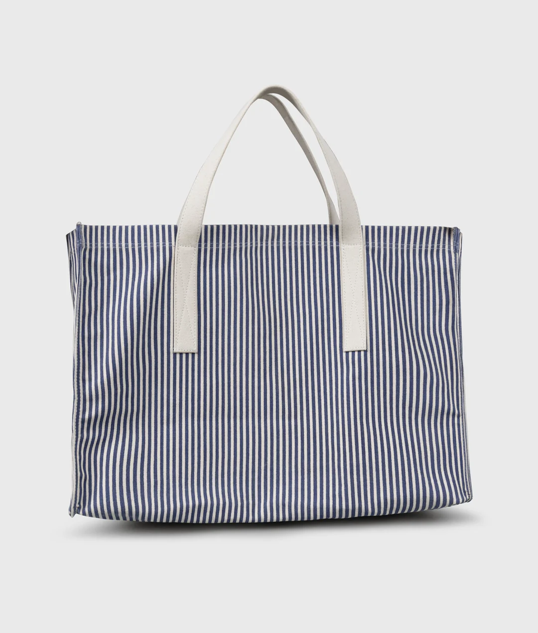 Bolso de lona de algodón a rayas. Con asas, correa de hombro extraíble y ajustable, cierre de tachuelas a presión y logotipo de impresión en agua «10DAYS» en la parte posterior. Dimensiones : 48 × 68 × 18 cm.