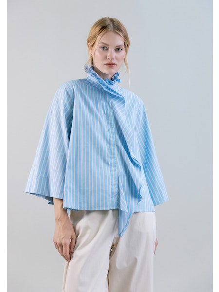 Camisa de popelín en estampado de rayas azules con volante en el cuello y en la parte delantera. Cierre de botones y manga tres cuartos.