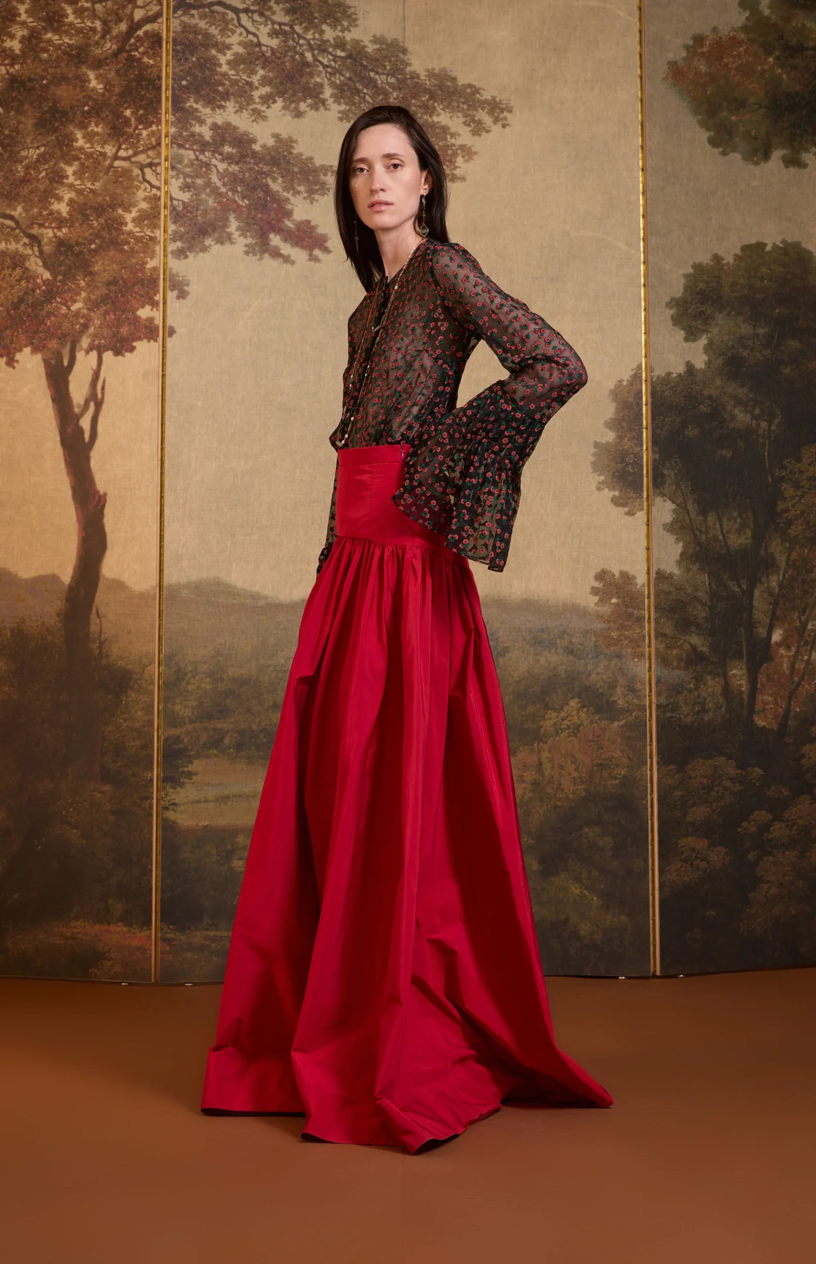 Falda con frunces en cadera y volumen escultórico. Composición: 62% PL 38% CO.