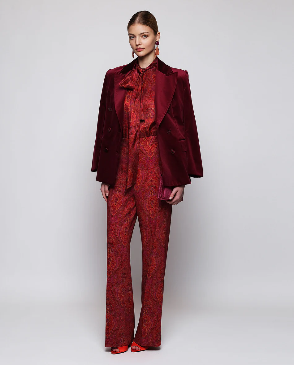 Pantalón rojo de tiro alto y corte recto con tejido estampado paisley en crepe elástico.