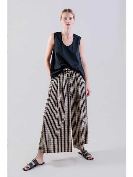 Pantalón tipo falda en tejido de tencel con estampado de cuadros negro y beige.