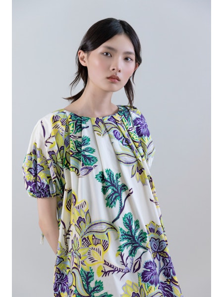 Vestido realizado en tejido 100% algodón estampado con manga corta tipo farol.